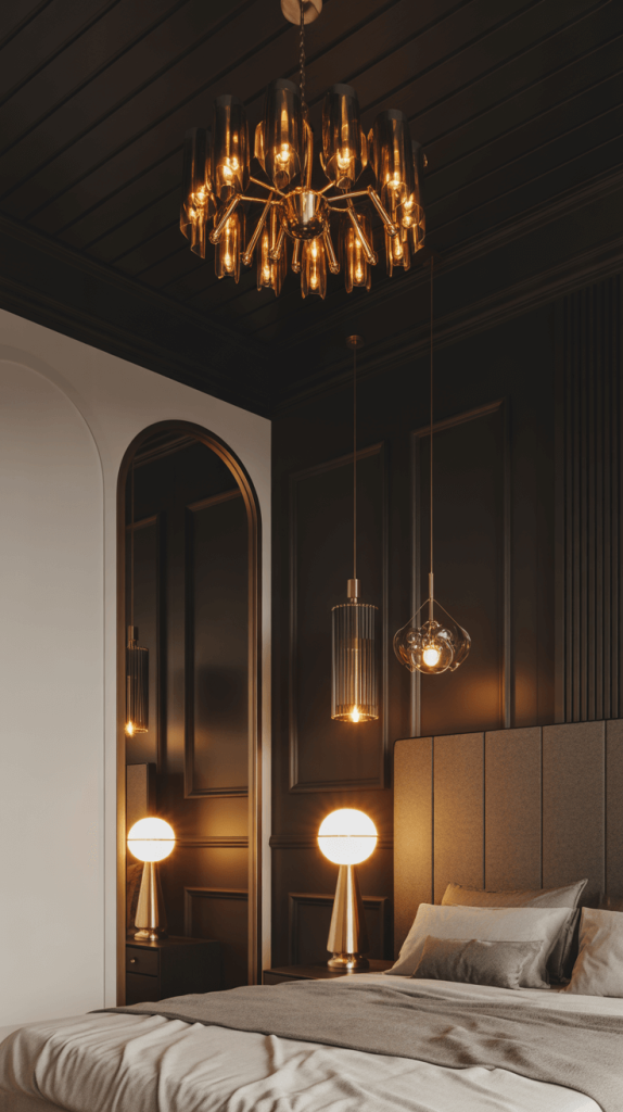 - Start with Lighting: A stunning gold or brass chandelier or a pair of geometric pendant lights is the perfect starting point. The light will reflect off the metallic finish, creating gorgeous pools of light against the dark ceiling.