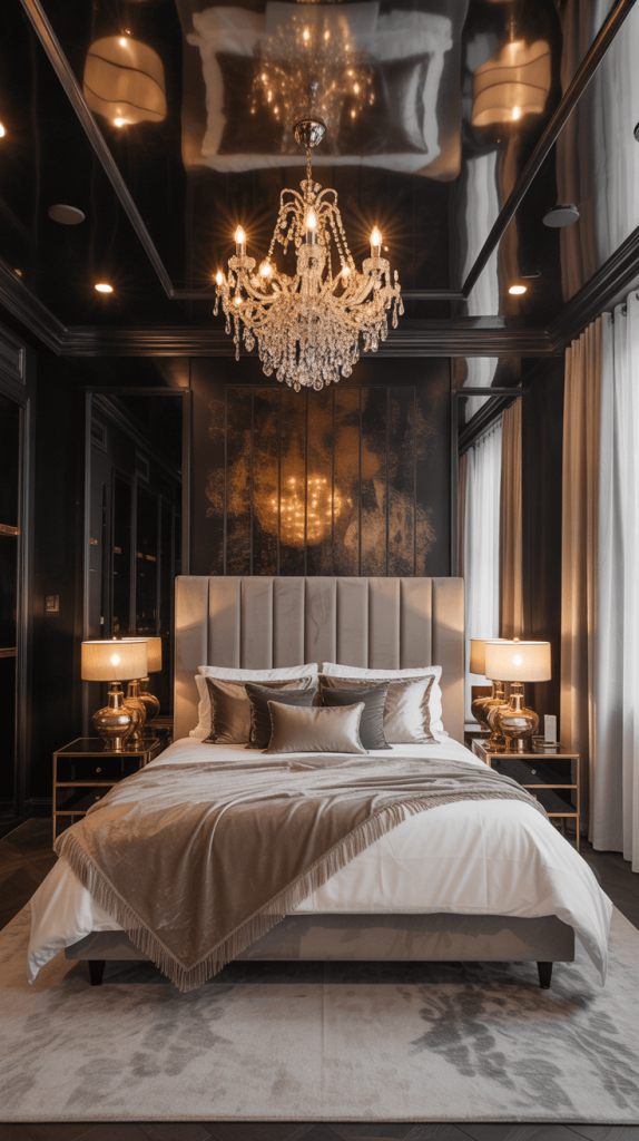 - Metallic and Crystal Details: A crystal chandelier, gold-leaf accessories, or mirrored furniture will amp up the glamour factor to eleven.