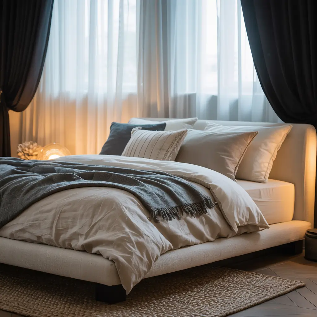 I tried this in my guest bedroom, pairing simple black linen curtains with white walls, a light oak bed frame, and cozy white bedding. The result? A space that feels both serene and sophisticated. Add a few potted plants and some chunky knit throws, and you’ve got Scandi perfection with a twist.