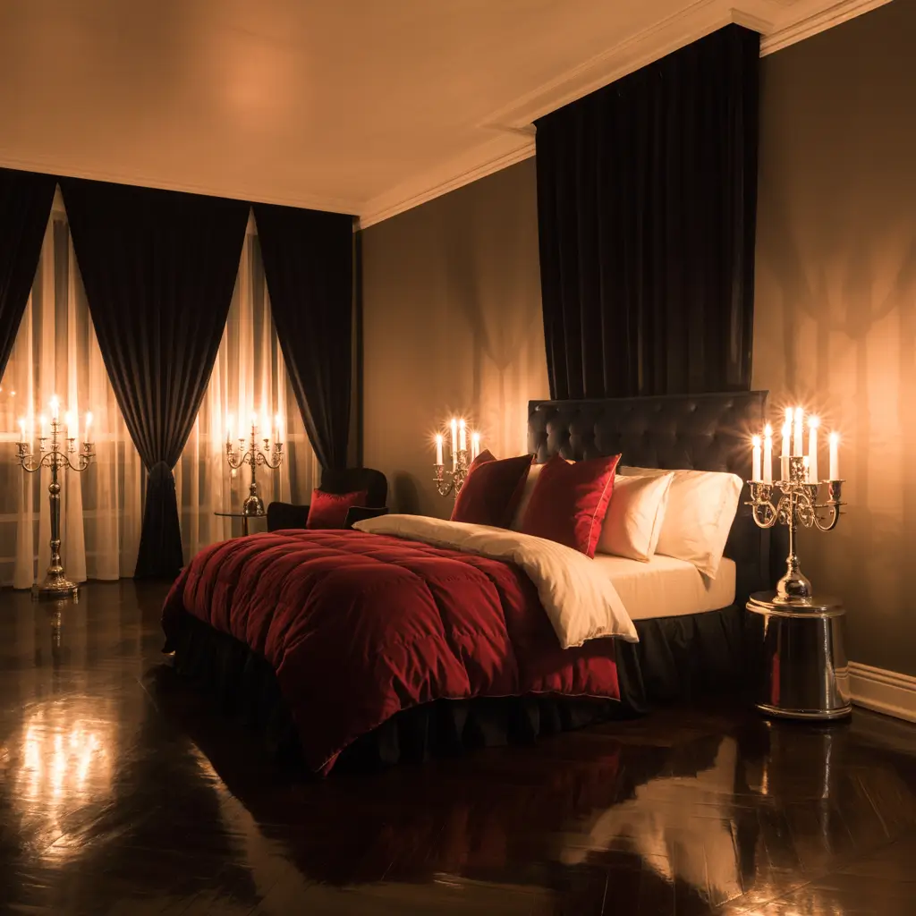 The contrast between the dramatic black curtains and delicate romantic elements creates this beautiful tension that’s incredibly appealing. Add some crystal chandeliers or vintage-style table lamps, and you’ve got a bedroom worthy of a romance novel.