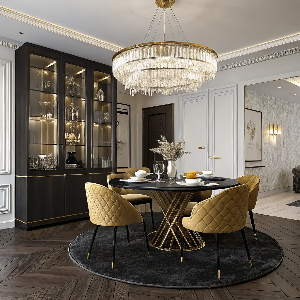Pendant lights with gold fixtures become jewelry for your dining room. Look for designs where the gold appears in unexpected placesโinside lamp shades, along cord covers, or as subtle accent rings. Position multiple pendants at varying heights for visual interest. The gold reflects beautifully onto the black table surface, creating these gorgeous warm pools of light.