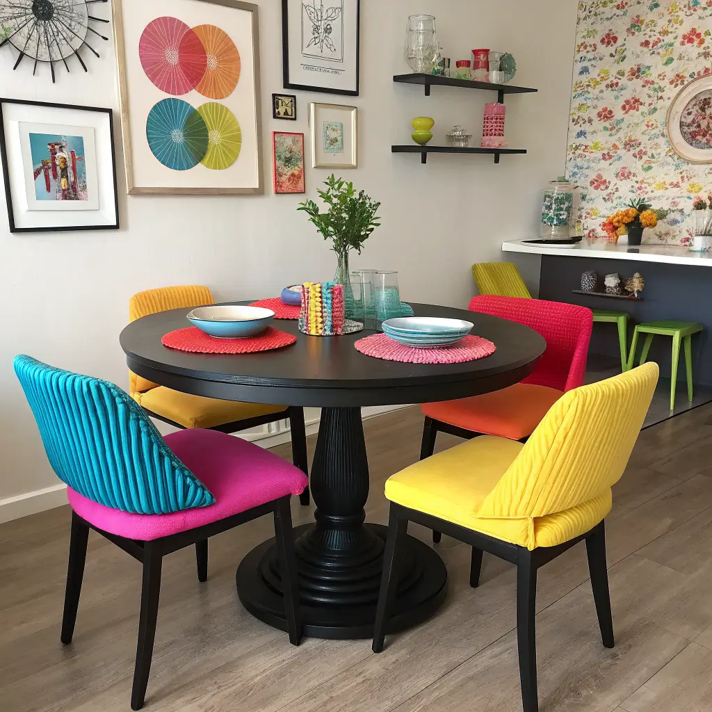 Want to know the fastest way to make a black dining table feel playful? Surround it with chairs in unexpected colors. This approach turns your dining area into an instant conversation starter.