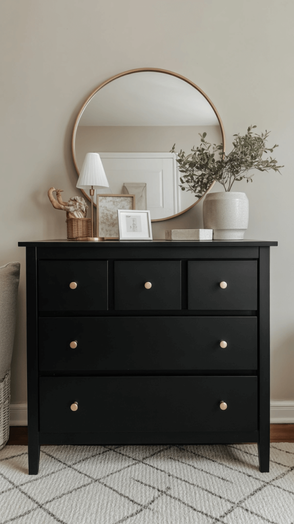 • The Backdrop: Keep the walls a bright white or a very light grey. This makes the black dresser stand out as a deliberate design choice and prevents the room from feeling dark.