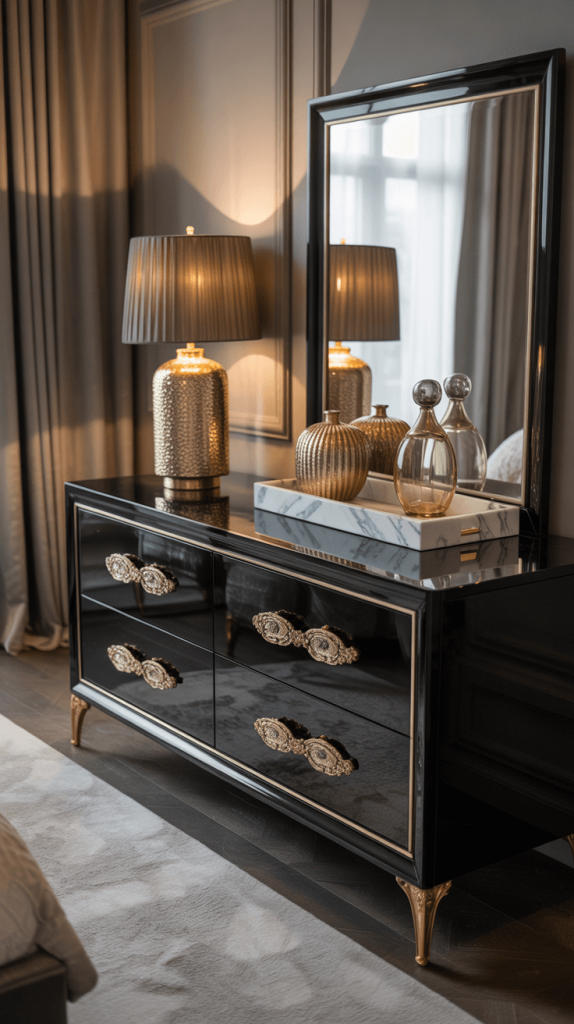 • Mix Textures: Not all gold has to be shiny. A matte black dresser with brushed brass hardware feels incredibly modern. A glossy black dresser with polished, gleaming gold feels more opulent and traditional.