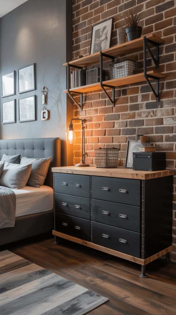• Concrete and Brick: If you have an accent wall, faux brick or concrete wallpaper behind the black dresser would cement the industrial vibe (pun intended). The combination of textures is key.