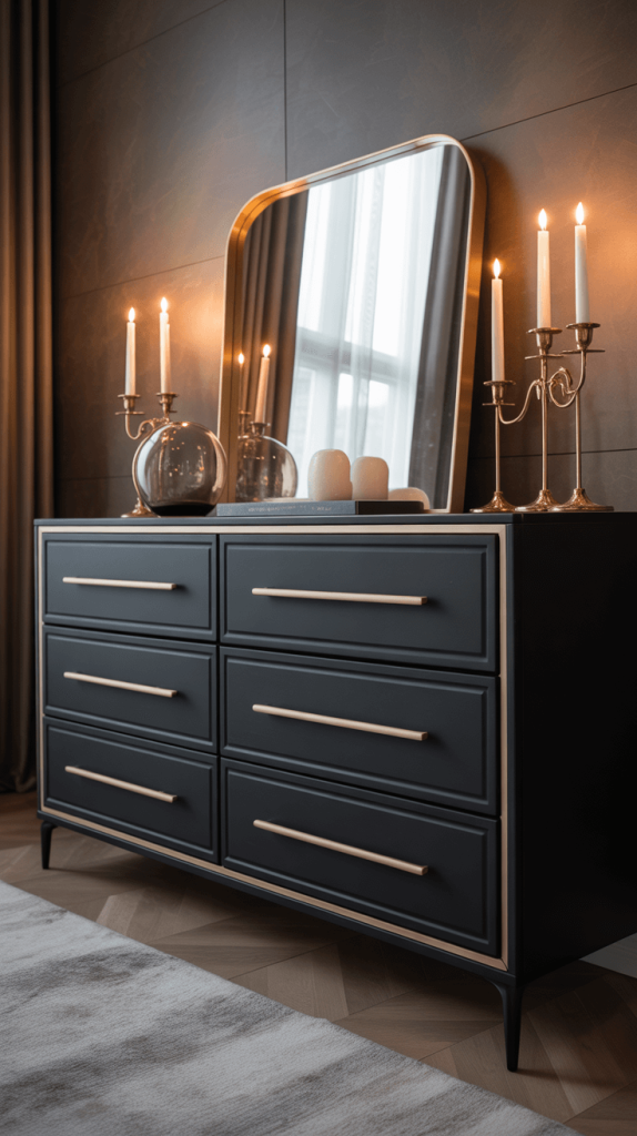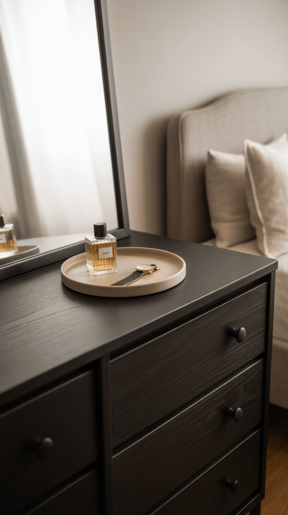• Style Over Substance: Sometimes, it’s not about the dresser itself, but what you put on it. If you have a light wood dresser you hate, style the top with predominantly black accessories. A black lamp, a black frame, a black tray. It draws the eye upward and makes the actual dresser feel less prominent.