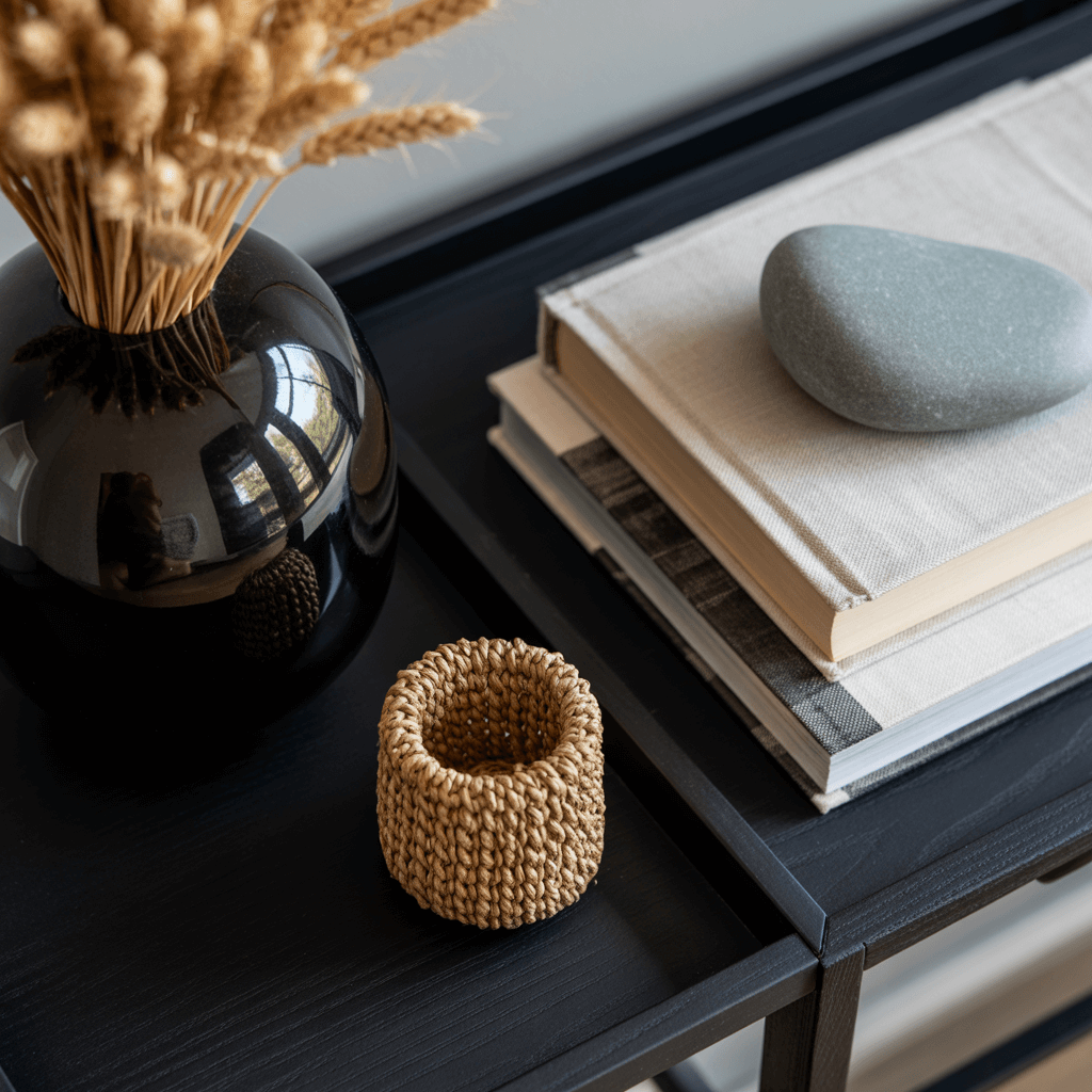 - Why It Works: Texture adds depth and makes a space feel inviting and tactile. The black table is the perfect smooth canvas for this experiment.