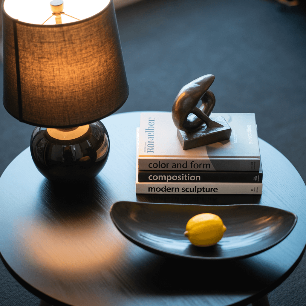 - A Black Lamp: Wait, black on black? Trust me. A black ceramic lamp with a crisp white shade on a black table is a masterclass in monochromatic texture.