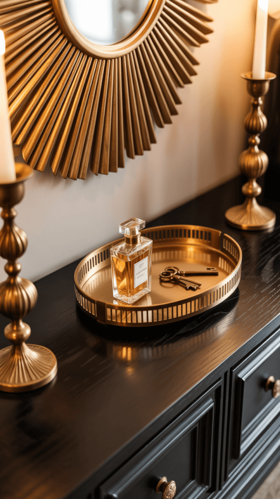 - The Core Idea: Pair your dark table with metallic accessories. A gold-framed mirror or art piece is a classic starting point. Add a brass tray to corral smaller items, a pair of candlesticks, or a metallic lamp base.