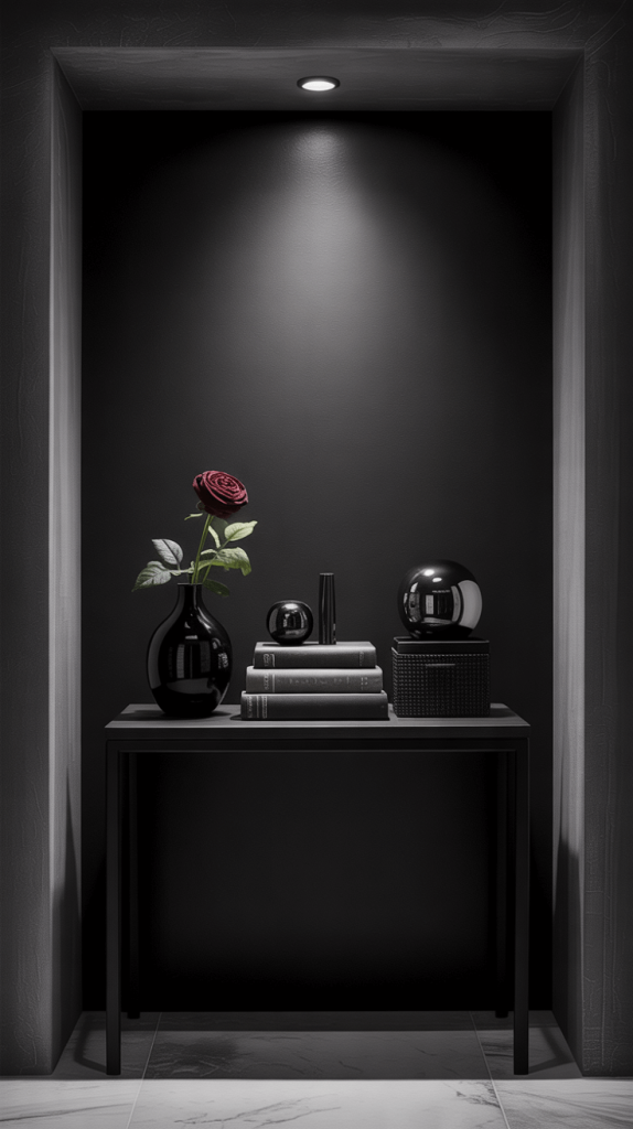 - How to Nail It: Combine a matte black vase, a glossy black picture frame, a textured black woven basket underneath, and a silver-black metallic object. See? All “black,” but so much variation.