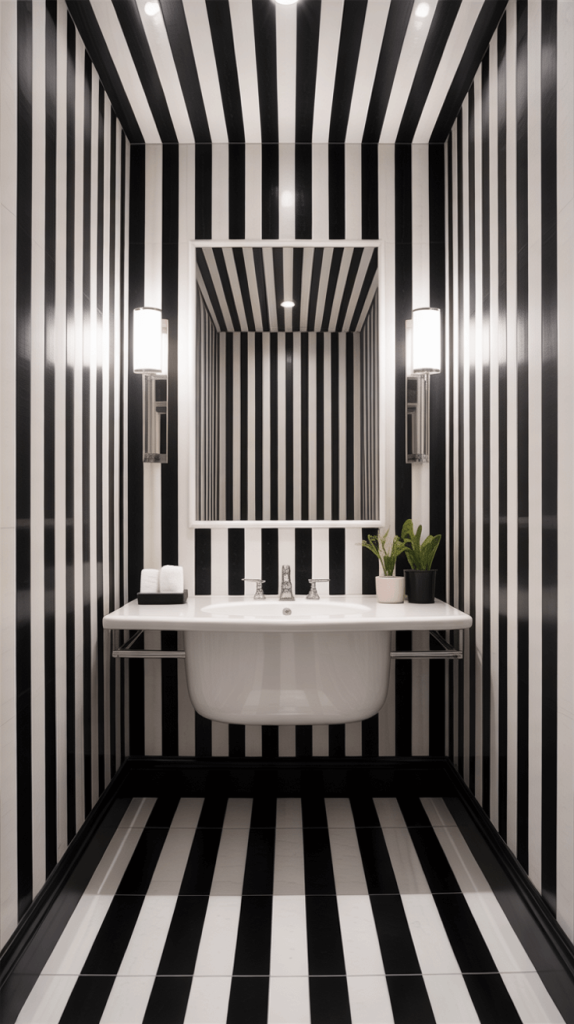 If you have a short bathroom and want to make the space feel taller, vertical black-and-white stripes are an excellent choice. The lines will draw the eye upward, creating the illusion of more height.