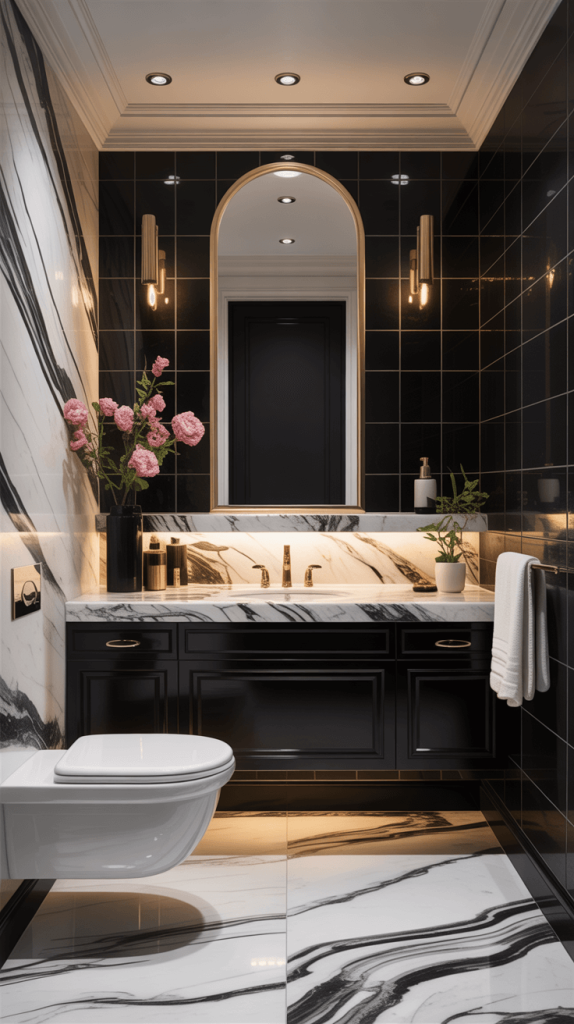 Consider using marble for countertops, shower walls, or accent pieces, while keeping the floor or feature wall black.