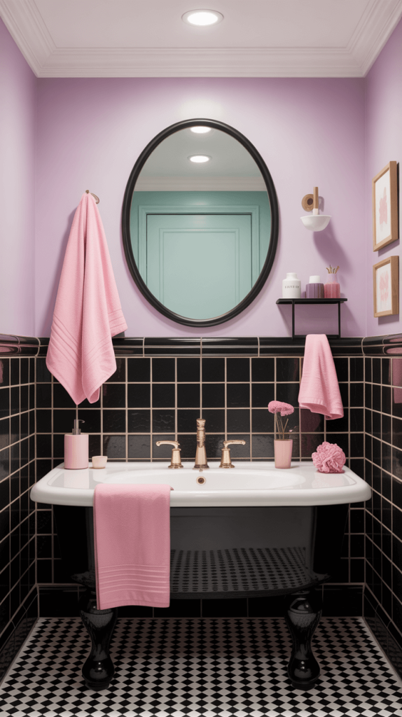 Light shades of pink, mint, or lavender in towels, art, or even the walls can offset the intensity of black tiles, giving your bathroom a fresh and balanced vibe.
