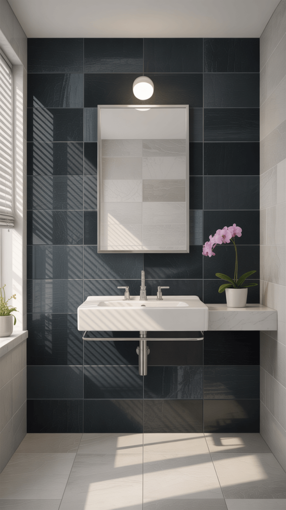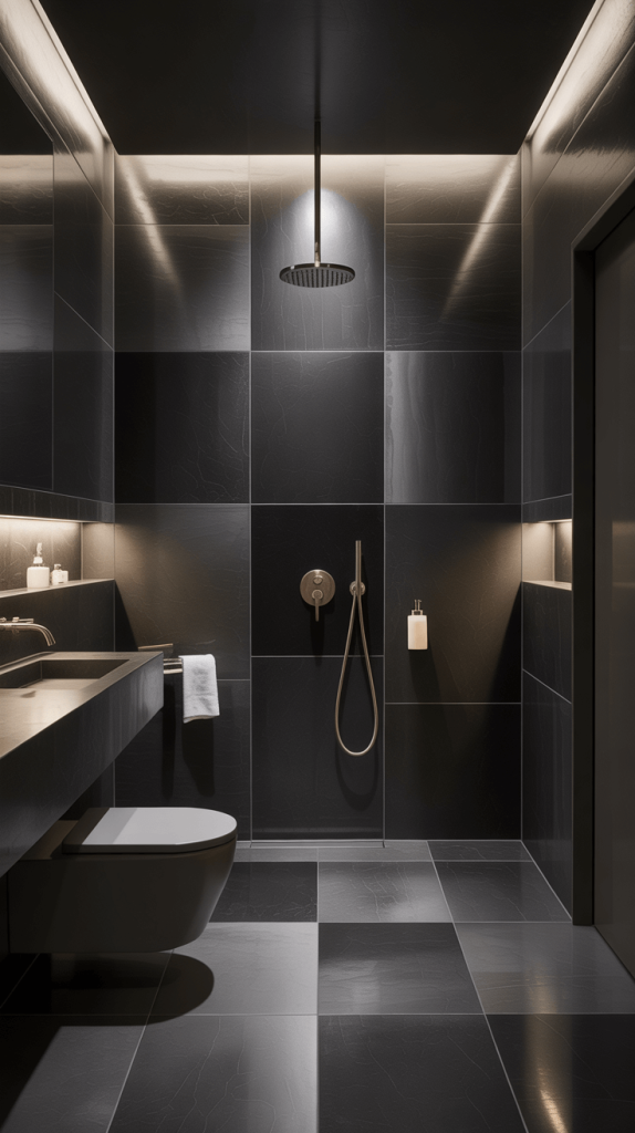 15. Black Tile Feature Wall with Minimalist Fixtures