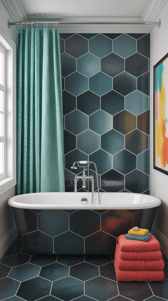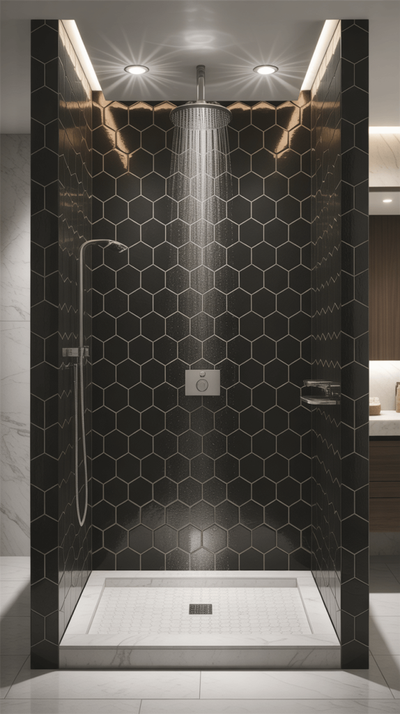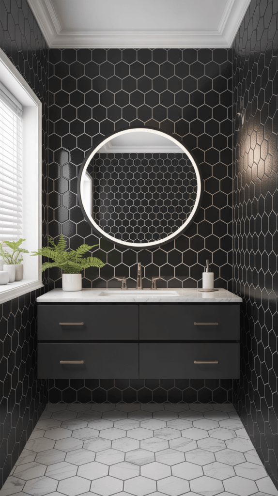 This combination is particularly effective when using smaller black tiles like hexagons or subway tiles.