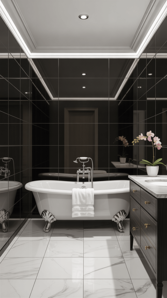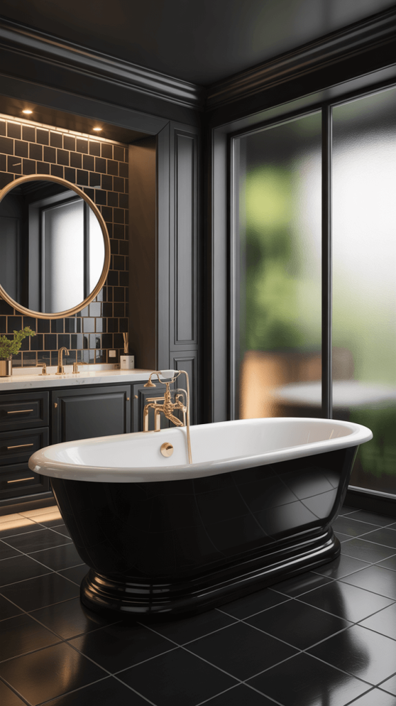 To keep the space from feeling too dark, balance the black tiles with white or light-colored fixtures, and ensure there’s ample lighting.
