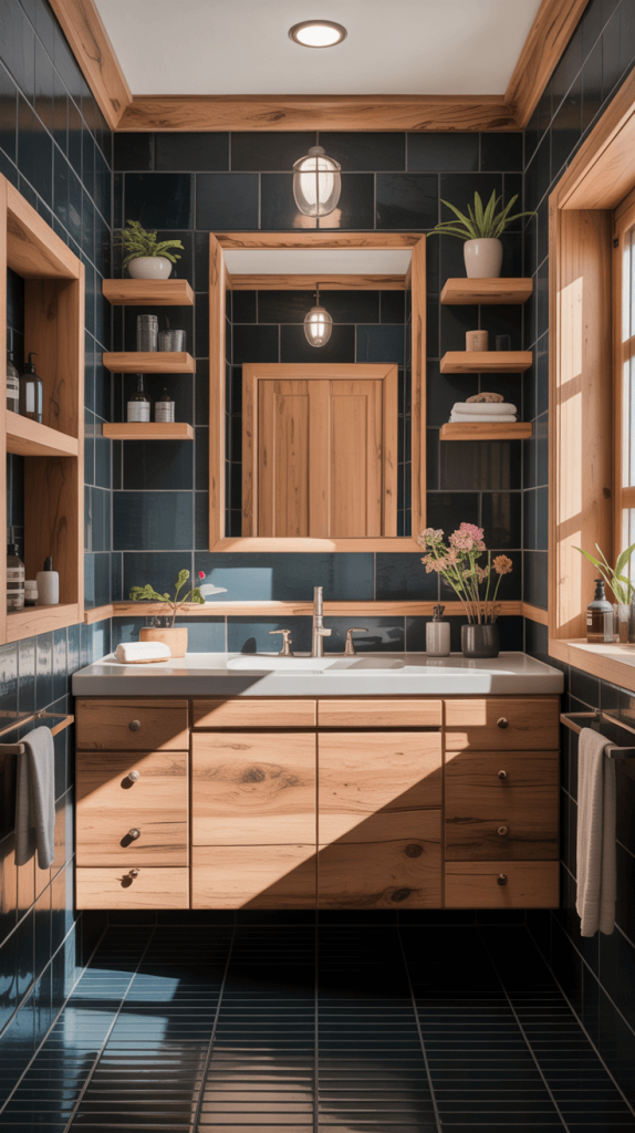 This combination works especially well in bathrooms with plenty of natural light, allowing the wood to shine.