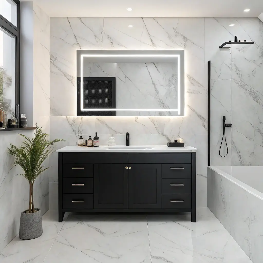 Ready to go all out? Luxury black vanities are where things get really fun. We’re talking double sinks, exotic stone countertops, and custom millwork that makes your bathroom feel like a five-star spa.
