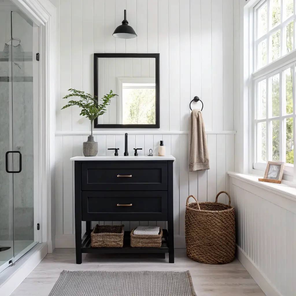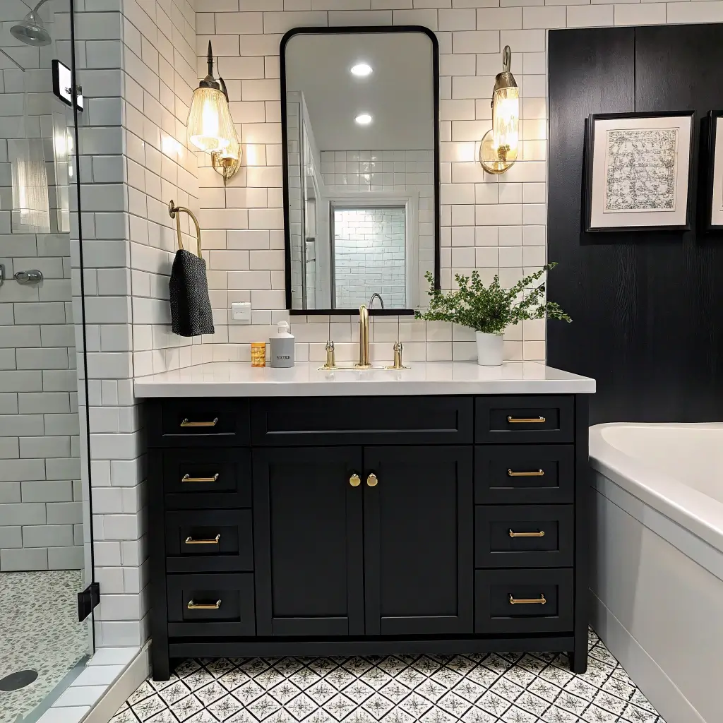 Here’s my secret weapon: pair that black vanity with a large mirror and bright white walls. The contrast creates depth, and the mirror doubles your visual space. It’s basically bathroom design wizardry, and it works every single time.