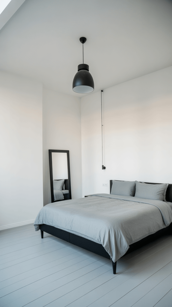 The rule is simple: keep the largest surfaces light. Your walls and ceiling should be white or a very, very light grey. This reflects the most light and makes the space feel open. Now, bring in your black and darker grey through furniture and decor. A dark bed frame against a white wall will actually recede, creating a feeling of depth. Use a mirror to double the light and the sense of space.