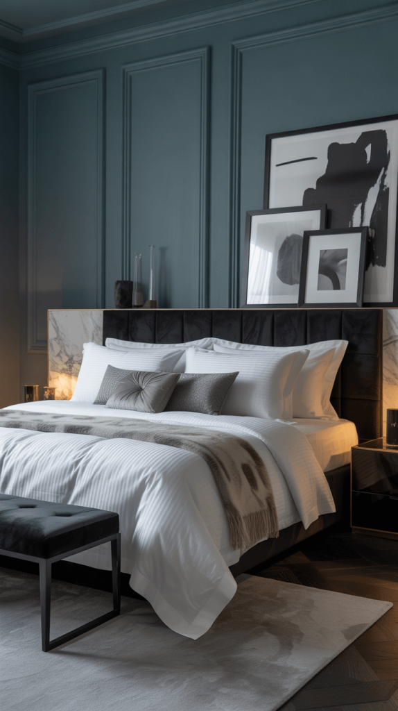 4. Luxury Grey Bedroom with Black and White Decor