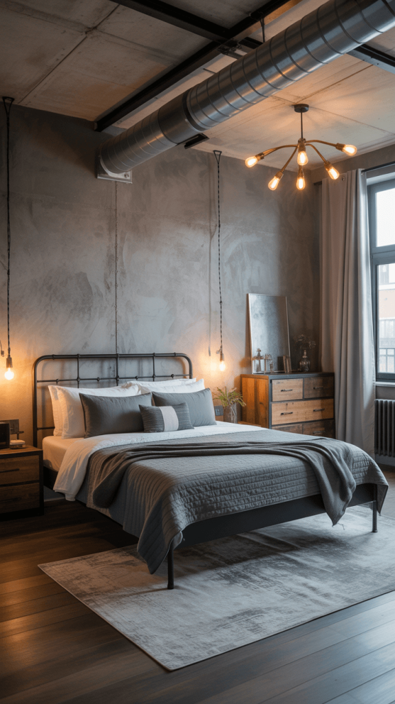 7. Industrial Bedroom with Black, White, and Grey Tones