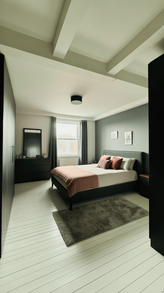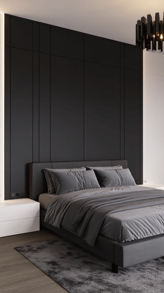 Modern design loves a strong graphic contrast. This style is bold, sharp, and confident. Imagine a dramatic black accent wall behind your bed, paired with the other three walls in a pure, gallery white.