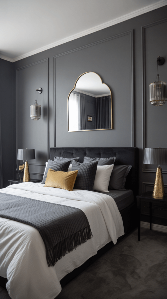 11. Black, White, and Grey Bedroom with Metallic Touches