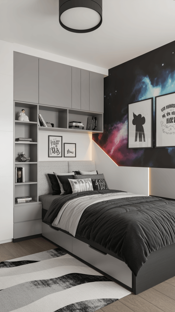 Make it fun! Let them choose a cool black and white wallpaper accent wall featuring their favorite band, a geometric pattern, or even a subtle galaxy print. Use removable decals for an easy, rental-friendly update. Incorporate grey furniture that’s durable and functional. Add personality with black and white posters, photos printed in black and white, and fun text-based art.