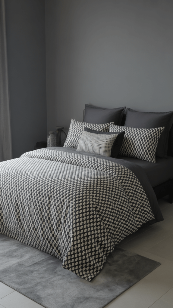 9. Black, White, and Grey Bedroom with Bold Patterns