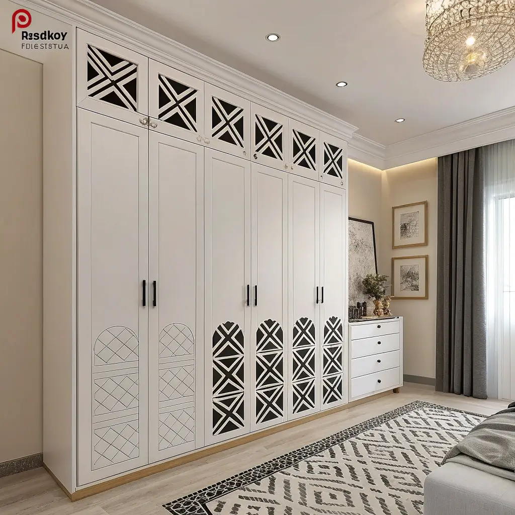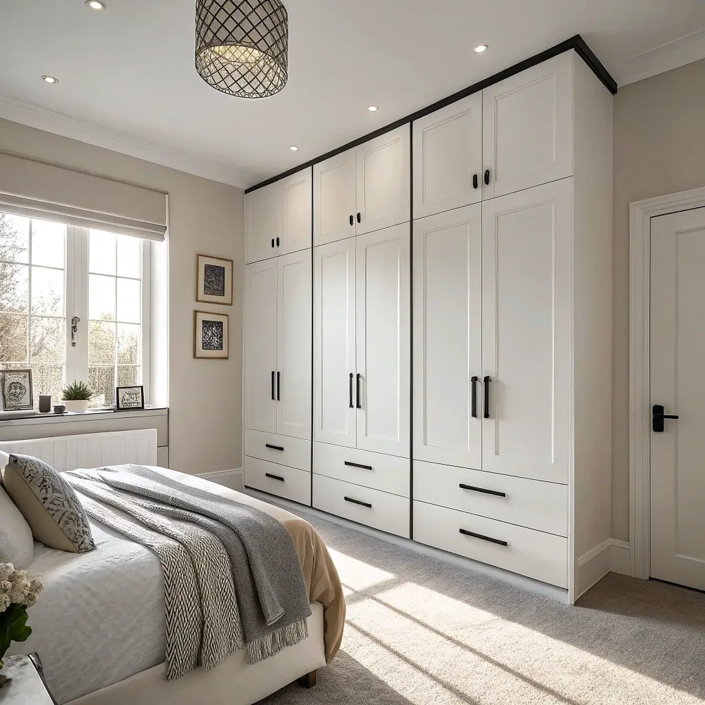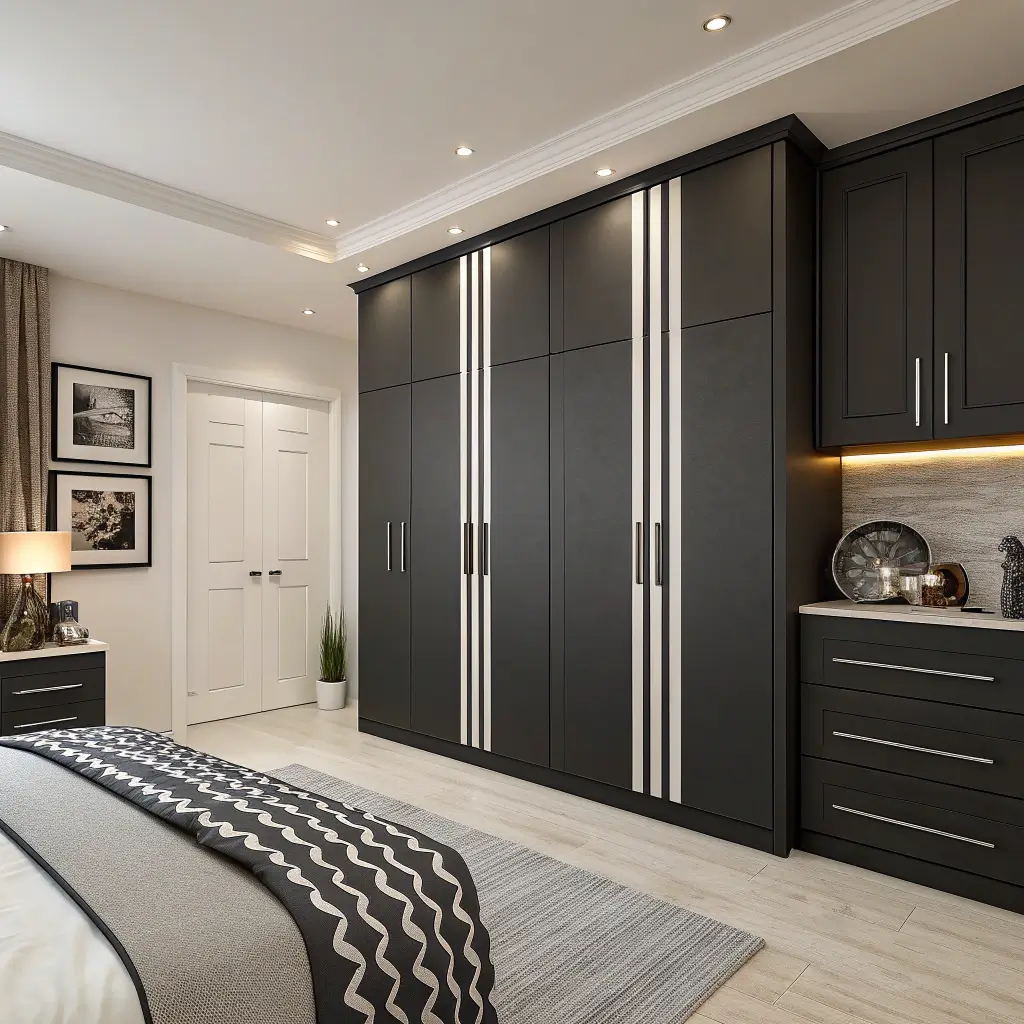 Who says bedroom storage has to be boring? White cupboards with black geometric patterns turn functional furniture into art. We’re talking triangles, hexagons, or even abstract designs that make your cupboards the room’s statement piece.