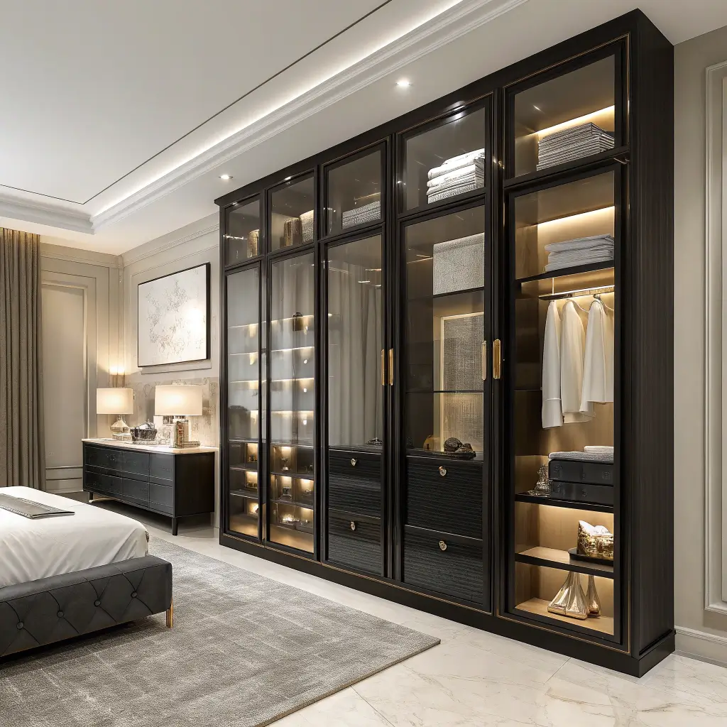 Opening these cupboards feels like unwrapping a present every time. The white interiors make finding things easier (ever tried finding a black shirt in a dark cupboard?), while the black glass exterior maintains that sleek, sophisticated look.