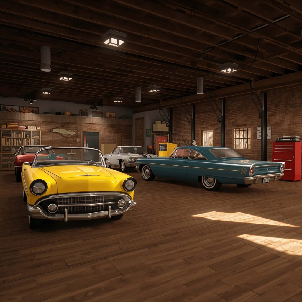 Don’t forget the details that bring life to the space. Add an old radio, maybe a mini-fridge for those long project nights, and definitely include that classic red tool chest. These little touches transform a basic garage into a believable workspace.