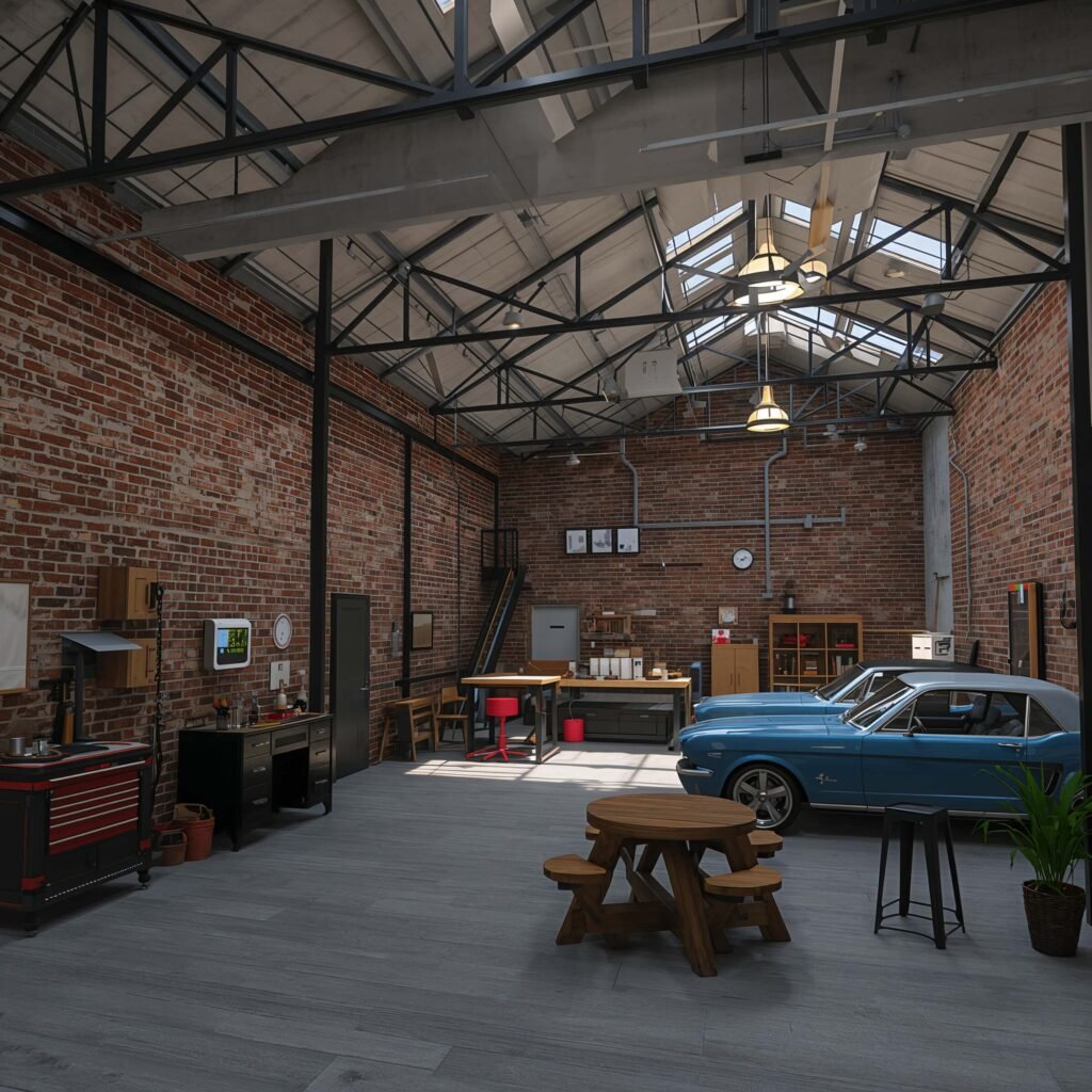 What really nails this aesthetic? Height. Build your garage taller than normal and add industrial windows near the ceiling. The extra vertical space combined with natural light creates that authentic loft feeling. Add some industrial pendant lights hanging from long cords for that finishing touch.