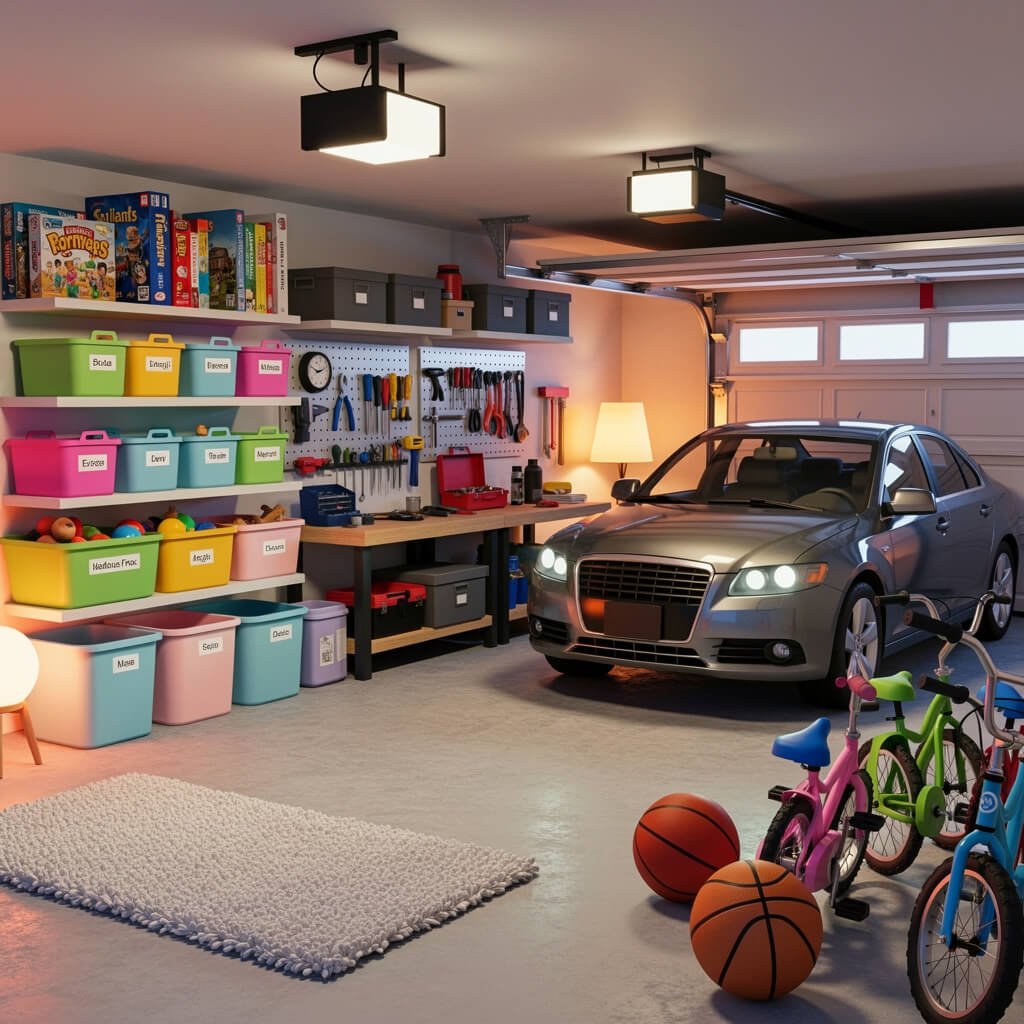 Think of this as an extension of your home, not just a parking space. Warm wood tones, soft lighting, and organized zones for everyone’s stuff. Create dedicated areas: parking spots marked with tape, bike storage for the kids, sports equipment zones, and maybe even a small workshop corner for weekend projects.