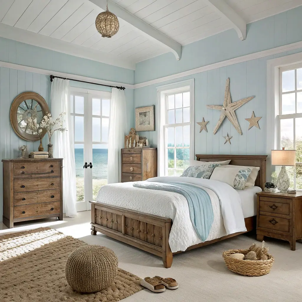Natural light plays a huge role here. Use sheer white curtains that flutter in the breeze, and position your bed to catch morning sunlight. A ceiling fan not only adds to the coastal aesthetic but keeps that ocean breeze flowing year-round (even if it’s just your imagination).