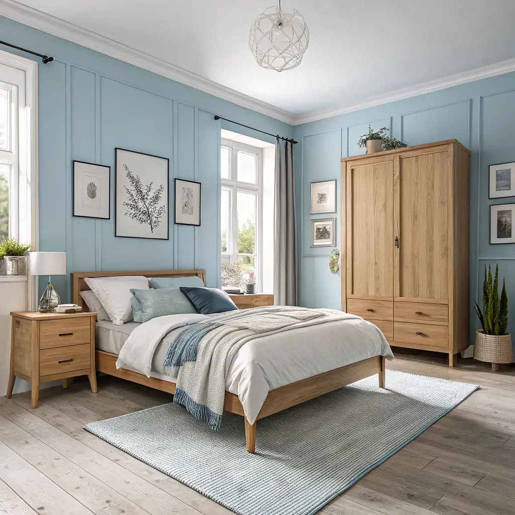 Start with a neutral base – white walls, light wood floors, and natural linen bedding. Add muted blue accents through throw pillows, a chunky knit blanket, or a single piece of abstract art. Brown comes through in natural wood furniture with clean lines and no unnecessary ornamentation.