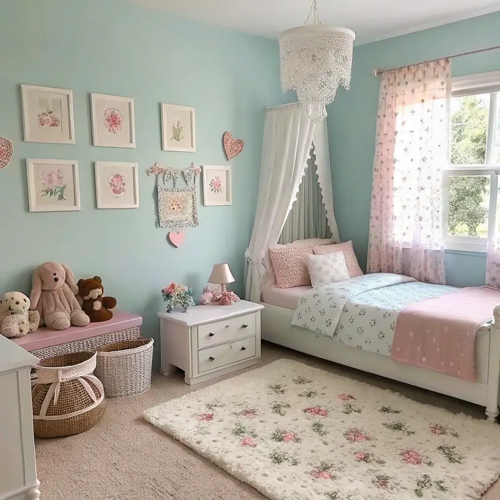 Creating a girls’ room that won’t need redecorating in six months when she decides pink is “so last year”? That’s the real challenge. Pastel blue and cream gives you flexibility while still feeling special and age-appropriate.