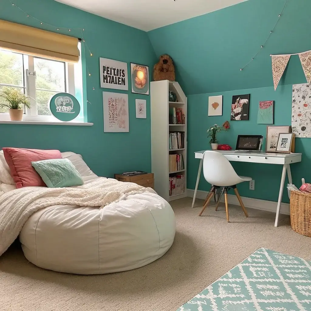 Start with cream walls (easier to paint over when they move out), then let them go wild with teal accents. A teal accent wall behind the bed? Perfect. Teal desk chair for homework they’ll definitely do? Essential. The cream keeps things from getting too intense while the teal adds personality.