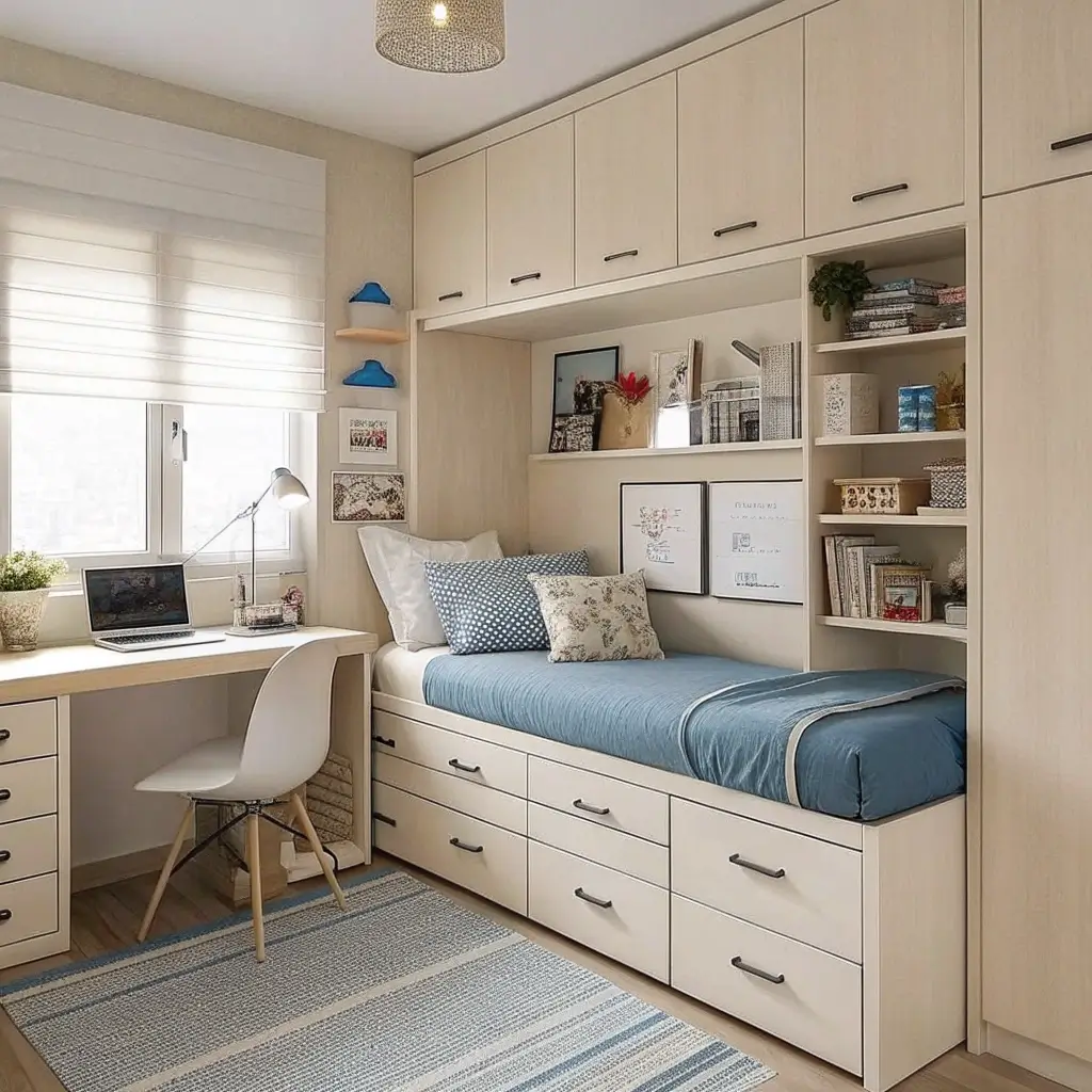 Small bedroom? The blue and cream combo is your best friend. These colors naturally expand visual space when you use them right. And no, that’s not just design-speak nonsense – it actually works.