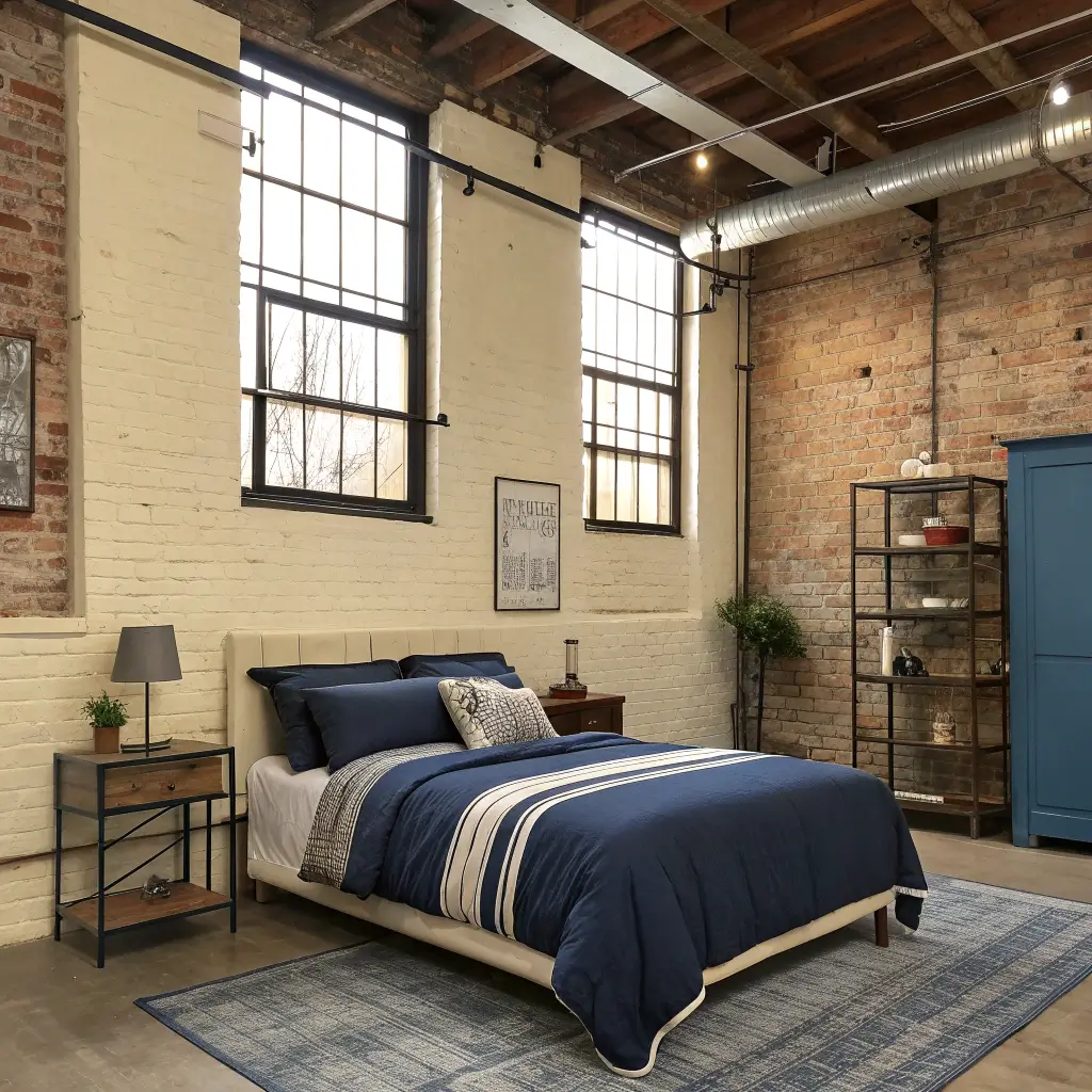 Industrial Blue and Cream Loft Bedroom