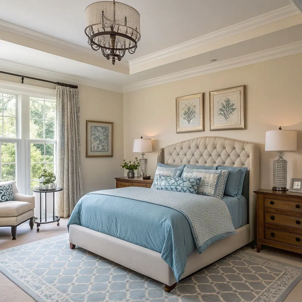 Transitional Blue and Cream Bedroom Design