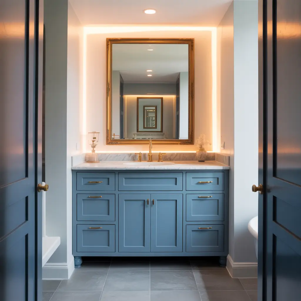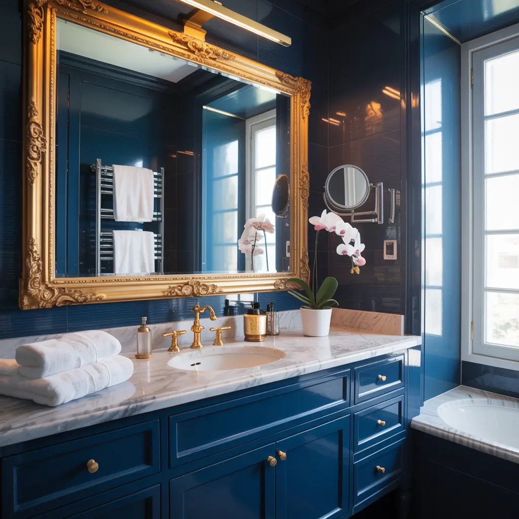 Sometimes one statement piece is all you need. A bold blue vanity topped with a show-stopping gold mirror can carry the entire room. This approach works especially well if you’re renting or can’t commit to permanent changes.