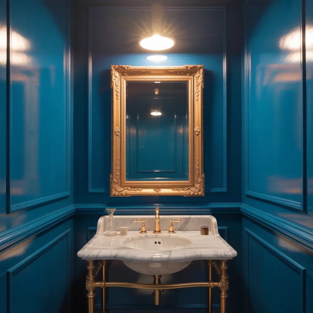 Paint an accent wall in high-gloss royal blue while keeping the other walls white or pale gray. Then add subtle gold touches through switch plates, toilet paper holders, and cabinet knobs. The restraint actually makes both colors feel more impactful.