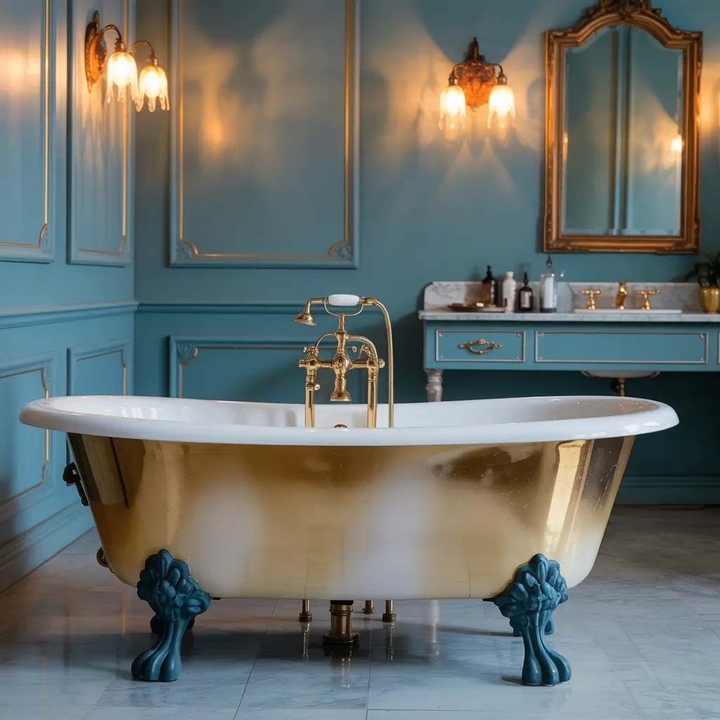 Start with classic elements like white hexagon floor tiles with blue flower accents. Add a navy blue clawfoot tub (they make those now!) with gold feet and fixtures. The vintage vibe comes from mixing periods – maybe an Art Deco mirror with Victorian-style gold faucets.