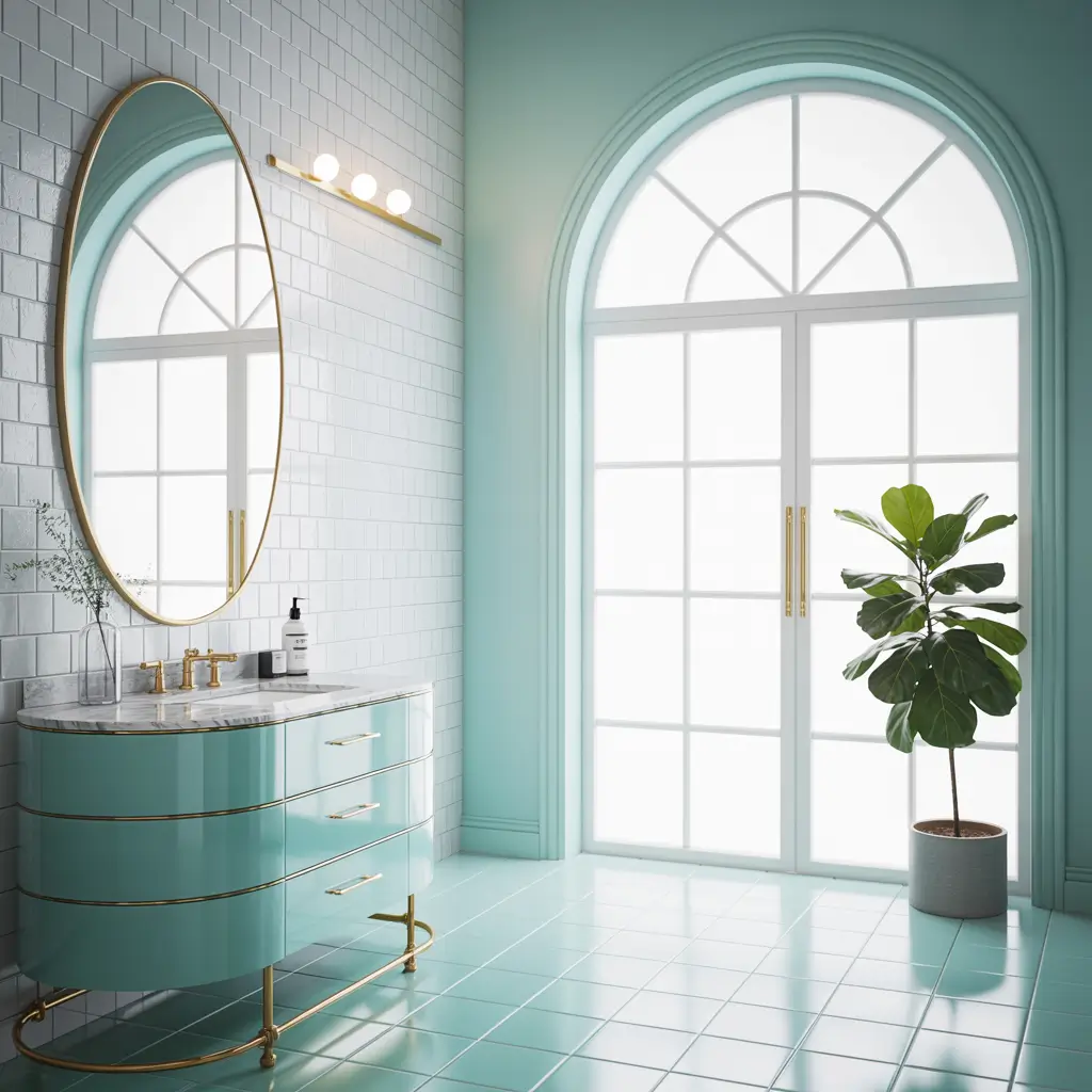 Aqua tile in a glossy finish reflects light beautifully, especially when paired with gold fixtures that catch and amplify that reflection. This combo works especially well in kids’ bathrooms or guest baths where you want something memorable but not too serious.