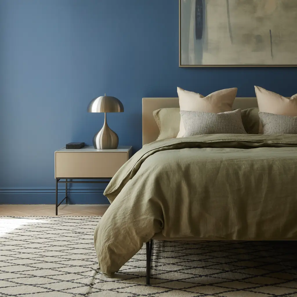 Navy serves as your grounding color here – think of it as the new black. Paint one wall navy (preferably behind your bed) and keep the others neutral. Then bring in olive through modern furniture pieces or abstract art. The contrast between the deep blue and earthy green creates visual interest without overwhelming the space.