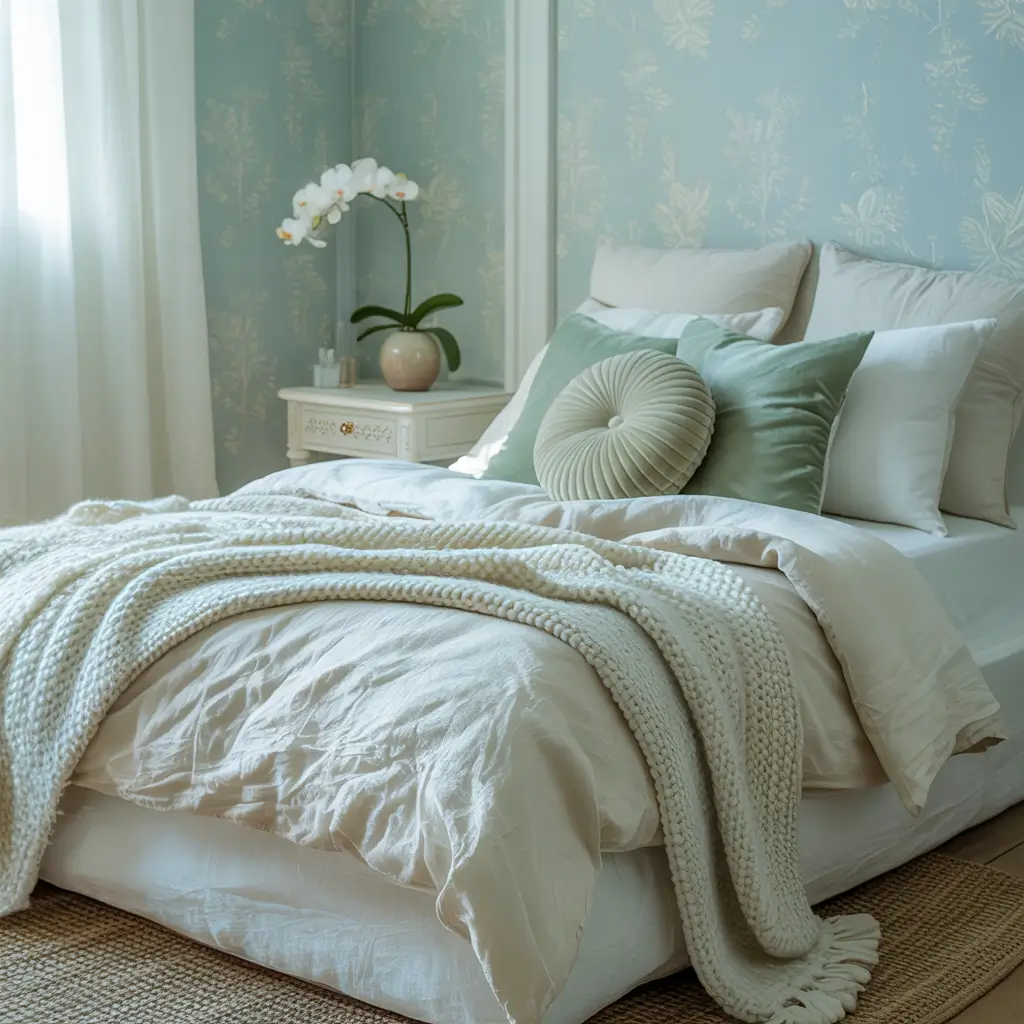 What really makes this combo sing? Texture, texture, texture! Grab some linen bedding in mint, throw in a few blue and white striped pillows, and maybe add a jute rug. The result feels fresh without being overwhelming – perfect for those of us who want calm vibes without the bedroom looking like a meditation retreat.