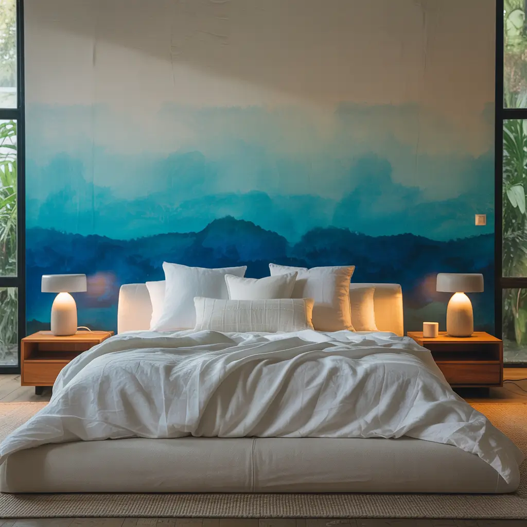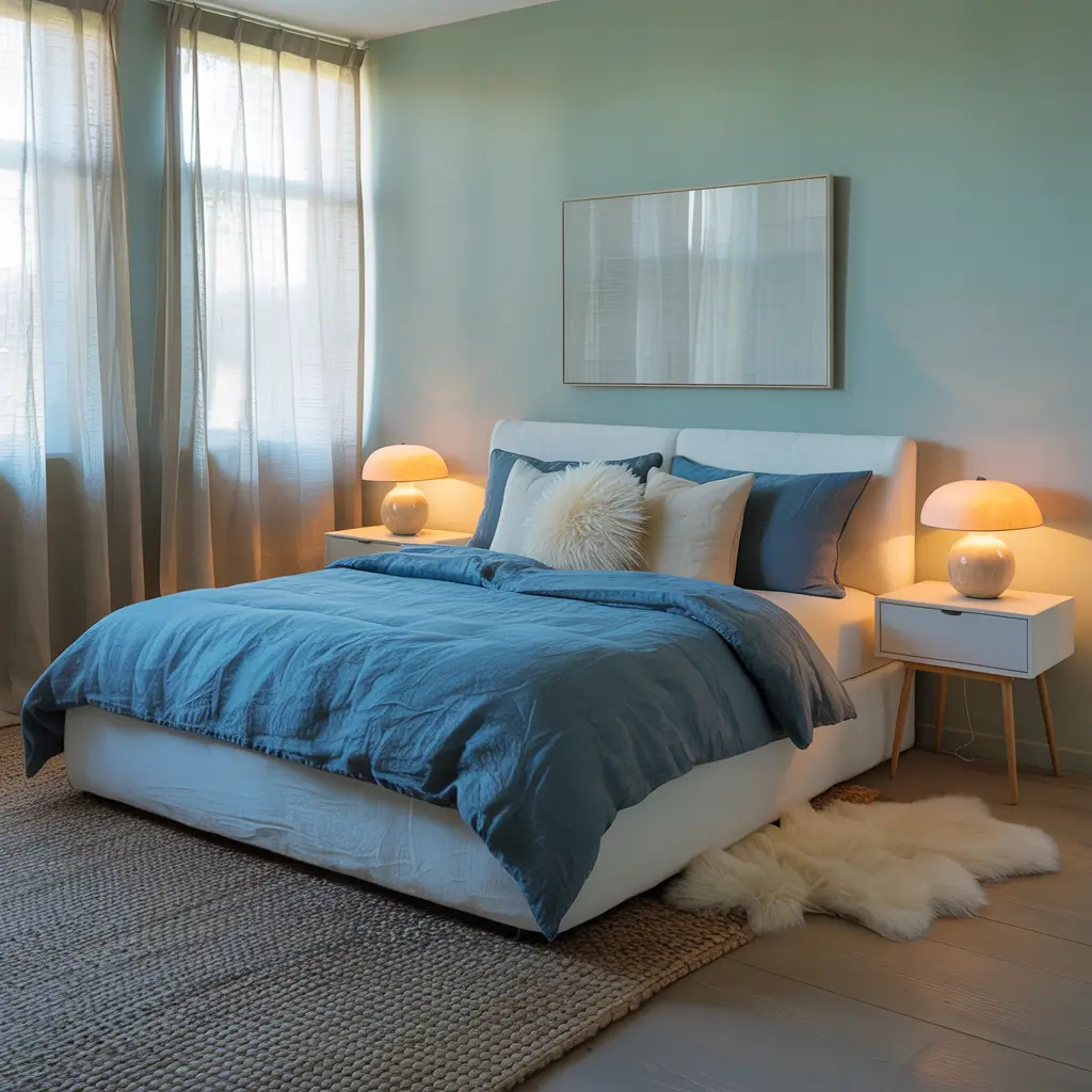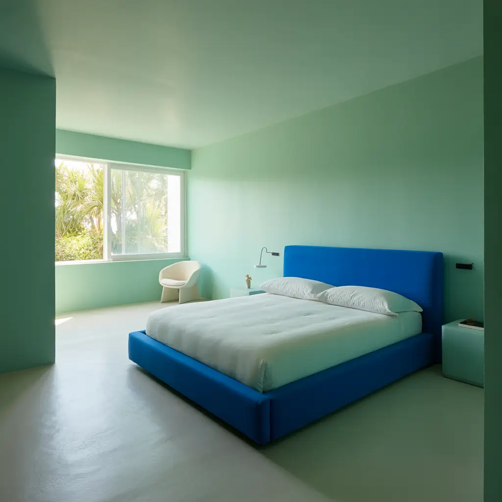 Keep the base neutral and simple – white walls, light wood floors, minimal furniture. Then add mint and cobalt through carefully chosen accents. A cobalt throw blanket folded at the foot of the bed, mint green pillows, maybe a single piece of artwork featuring both colors.