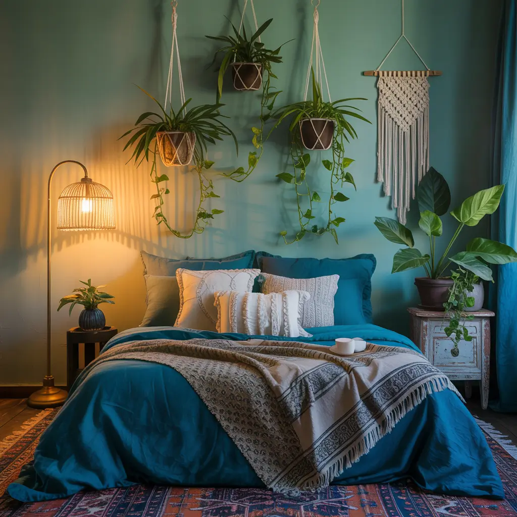Start with a neutral base and layer in your colors through textiles. A jade green tapestry behind the bed, cerulean throw pillows, maybe a vintage rug that incorporates both colors. The boho style gives you permission to mix and match patterns – just keep them in your color family.